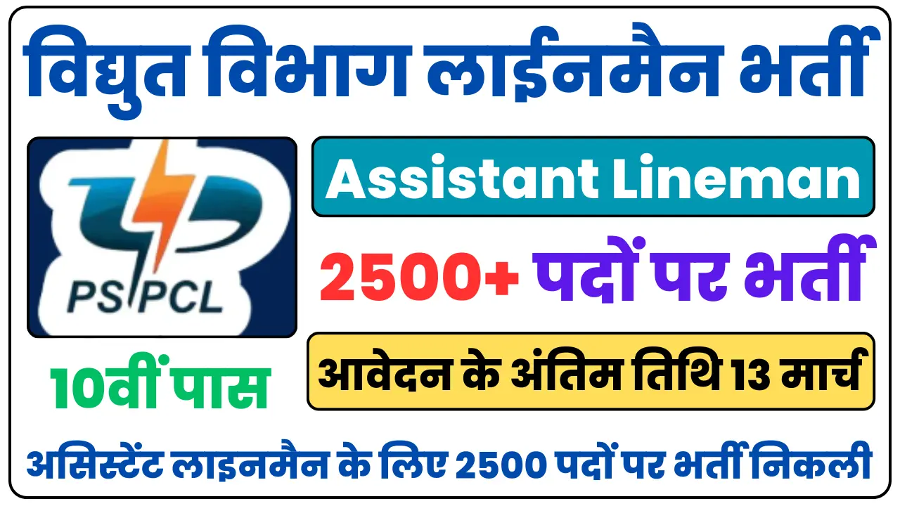 PSPCL Assistant Lineman Vacancy 2025 विद्युत विभाग में 2500 पदों पर भर्ती निकली, ऑनलाइन आवेदन यहां से करें: विद्युत विभाग लाईनमैन भर्ती के लिए अभी-अभी आधिकारिक विज्ञप्ति जारी कर दी गई है Assistant Lineman Recruitment 2025 के ऑनलाइन आवेदन 21 फरवरी से 13 मार्च 2025 तक किए जाएंगे पंजाब पावर असिस्टेंट लाइनमैन भर्ती के लिए ऑनलाइन परीक्षा का आयोजन 23 जून को किया जाएगा अधिक जानकारी प्राप्त करने के लिए आधिकारिक नोटिफिकेशन को जरूर देखें