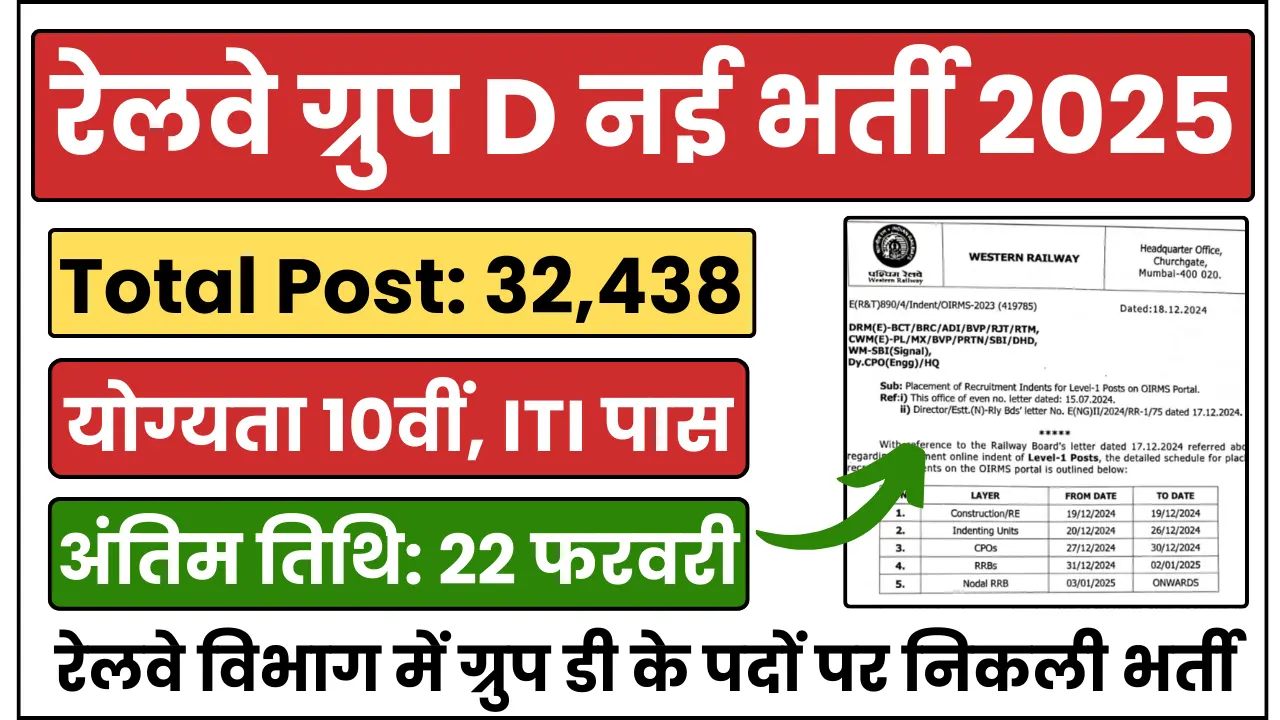Railway Group D Recruitment 2025 रेलवे ग्रुप डी के लिए 32438 पदों पर नई भर्ती निकली, योग्यता 10वीं, ITI पास: रेलवे ग्रुप डी भर्ती के लिए अभी-अभी आधिकारिक नोटिफिकेशन जारी भारतीय रेल विभाग में ग्रुप डी के लिए 28 दिसंबर को आधिकारिक विभक्ति जारी की गई है इस भर्ती के आवेदन 23 जनवरी 2025 से शुरू किए जाएंगे