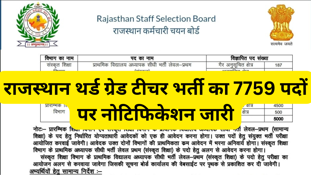 Rajasthan 3rd Grade Teacher Recruitment 2025 राजस्थान में भावी शिक्षकों के लिए, राजस्थान तृतीय श्रेणी शिक्षक भर्ती 2025 का अधिकारी विज्ञापन जारी कर दिया गया है राजस्थान कर्मचारी चयन बोर्ड (RSMSSB) के अनुसार, लेवल 1 (प्राथमिक शिक्षक) और लेवल 2 (उच्च प्राथमिक शिक्षक) के पदों के लिए 7,759 पद रखे गए हैं।